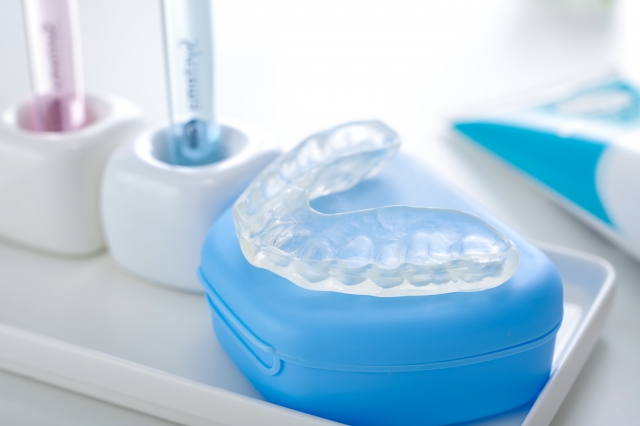 歯ぎしりや食いしばりの症状に合わせて、就寝時に装着する専用のマウスピースを作製しています。歯と歯同士が直接こすれるのを防ぐことで、歯のすり減りや欠け、割れを予防できます。噛み合わせの高さがわずかに変わることで力が入りにくくなり、顎の筋肉がゆるみやすくなるため、歯ぎしりの軽減が期待できる場合もあります。顎関節症の治療として用いられることもあります。