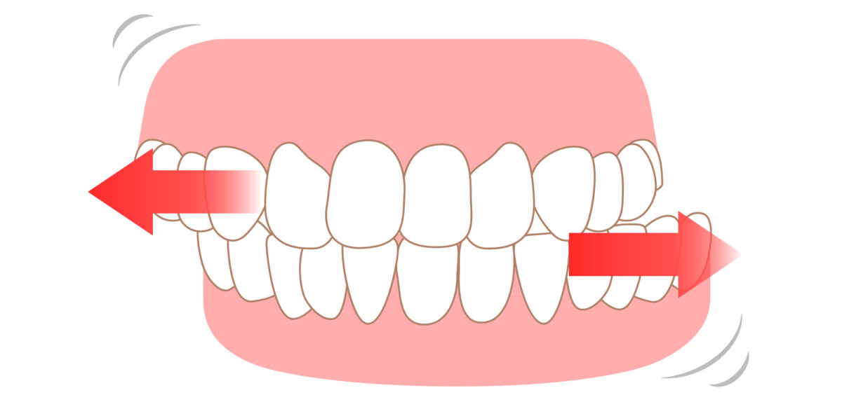 過剰な噛む力が長期間続くと、歯が少しずつ動き、噛み合わせや歯並びに変化が生じることがあります。見た目の問題だけでなく、噛みにくさや歯磨きのしにくさにつながり、お口全体の健康にも影響を及ぼします。