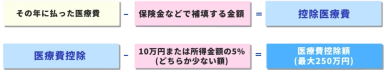 「1年間の医療費合計 - 保険などで補填された金額 - 10万円(または所得の5%)」で求められます。