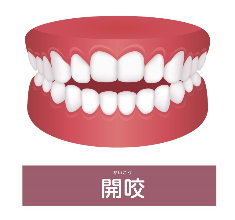 開咬は、奥歯は噛み合っているのに、前歯が上下で接触せずに隙間がある状態です。オープンバイトとも呼ばれ、噛み合わせの異常の中でも日常生活への影響が大きいです。原因には骨格の先天的な問題や、幼少期の指しゃぶり・舌癖・口呼吸などがあります。影響