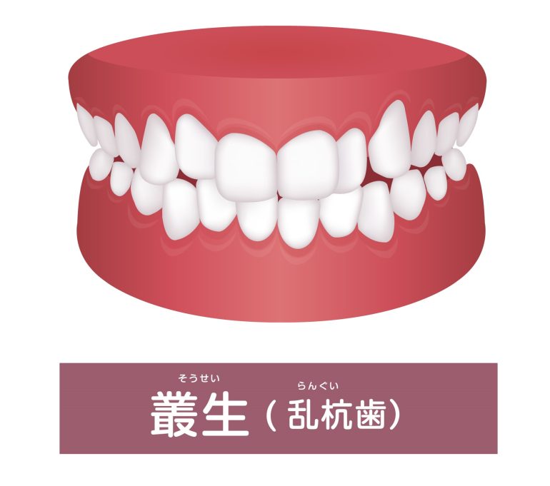 叢生は、歯が重なったりねじれたりして凸凹に並ぶ状態を指します。乱杭歯や八重歯もこの分類に含まれ、歯並びの乱れで最もよく見られるタイプです。原因の多くは、顎の大きさに対して歯が並ぶスペースが足りないことです。近年では、柔らかい食事が増えたことで顎の発達が十分でないお子さんも多く、叢生が増える傾向があります。